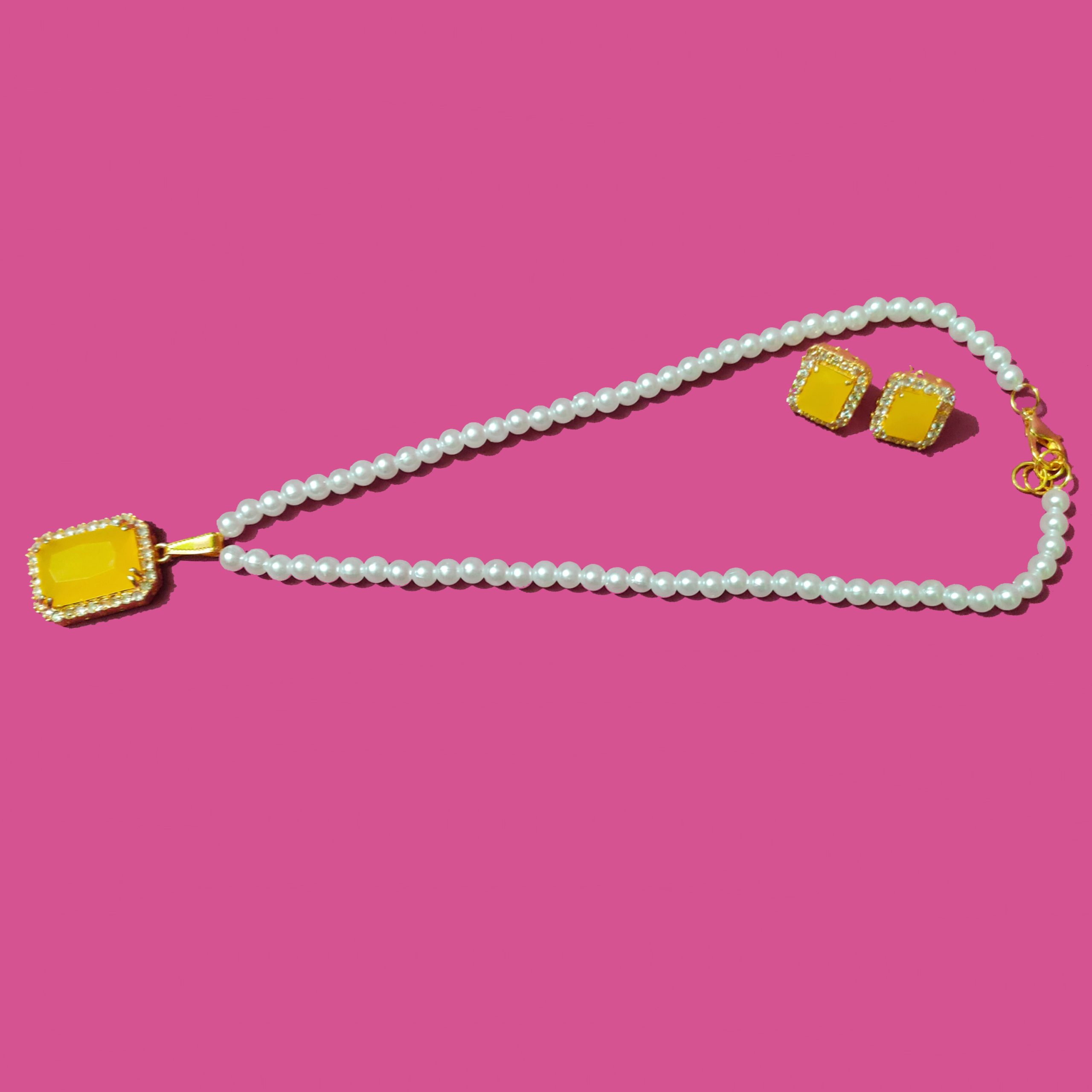 Elegant and eye-catching, this pearl necklace set features a striking yellow pendant and matching stud earrings. With a glossy finish and gold-plated details, it’s perfect for festive occasions, weddings, and evening wear. Light, stylish, and timeless — a must-have addition to your jewellery collection.